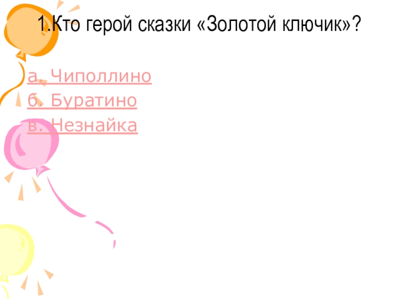 1.Кто герой сказки «Золотой ключик»?  а. Чиполлино б. Буратино в. Незнайка