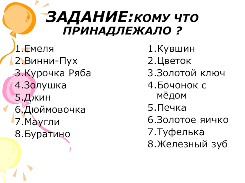 ЗАДАНИЕ:КОМУ ЧТО ПРИНАДЛЕЖАЛО ?1.Емеля2.Винни-Пух3.Курочка Ряба4.Золушка5.Джин6.Дюймовочка7.Маугли8.Буратино1.Кувшин2.Цветок3.Золотой ключ4.Бочонок с мёдом5.Печка6.Золотое яичко7.Туфелька8.Железный зуб