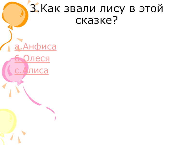 3.Как звали лису в этой сказке? а.Анфисаб.Олесяс.Алиса