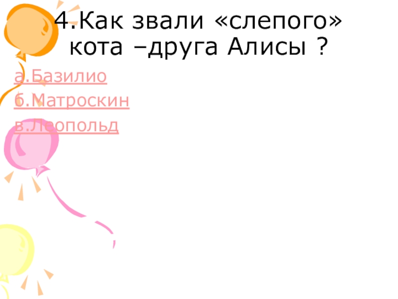 4.Как звали «слепого» кота –друга Алисы ?а.Базилиоб.Матроскинв.Леопольд