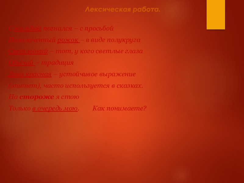 Лексическая работа. С мольбой погнался – с просьбойПозолоченный рожок – в виде полукруга Светлоокий – тот, у кого светлые глаза Обычай – традицияДева красная – устойчивое выражение (эпитет), часто используется в сказках.На стороже я стоюТолько в очередь