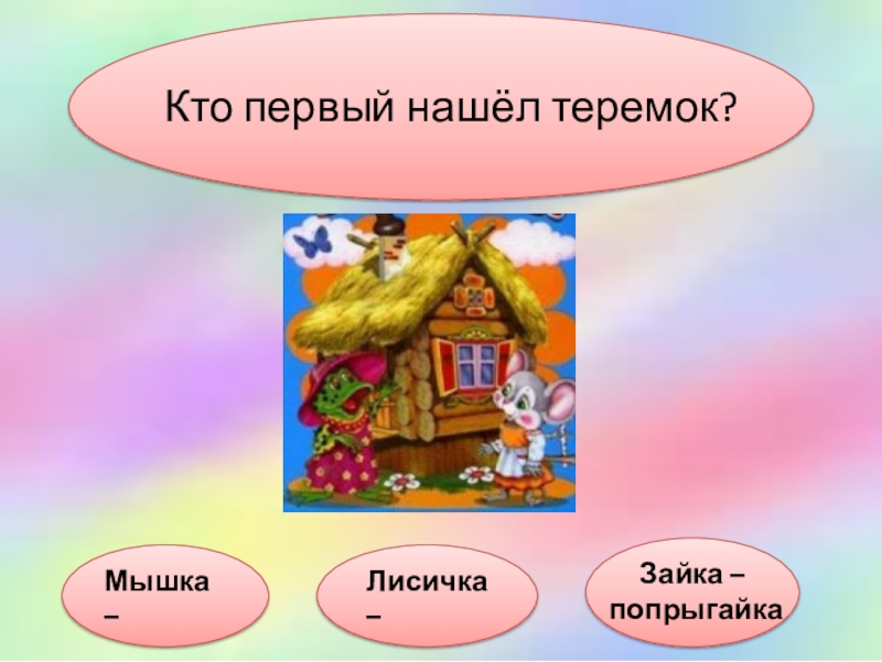 Кто первый нашёл теремок?Мышка – норушкаЛисичка – сестричкаЗайка – попрыгайка