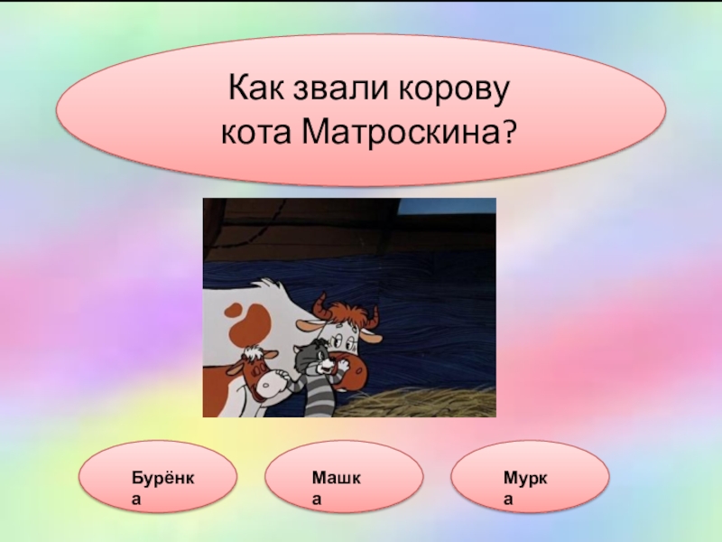 Как звали корову кота Матроскина?БурёнкаМашкаМурка