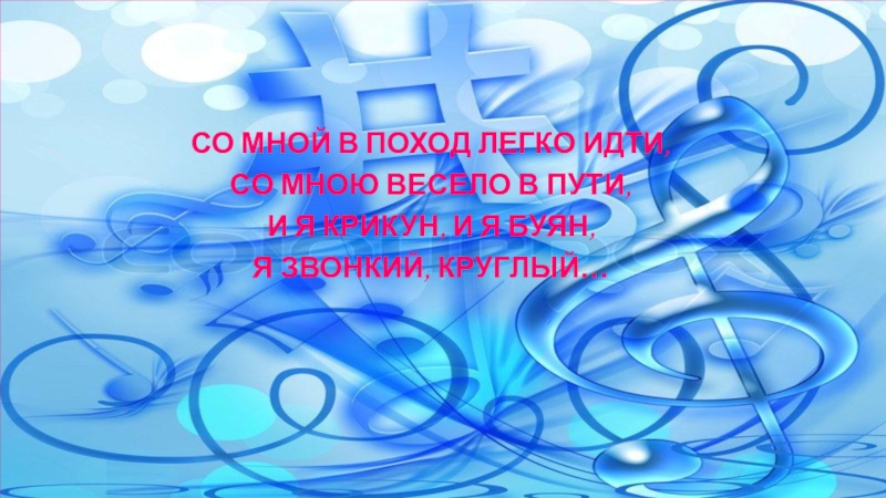 СО МНОЙ В ПОХОД ЛЕГКО ИДТИ,СО МНОЮ ВЕСЕЛО В ПУТИ,И Я КРИКУН, И Я БУЯН,Я ЗВОНКИЙ, КРУГЛЫЙ…