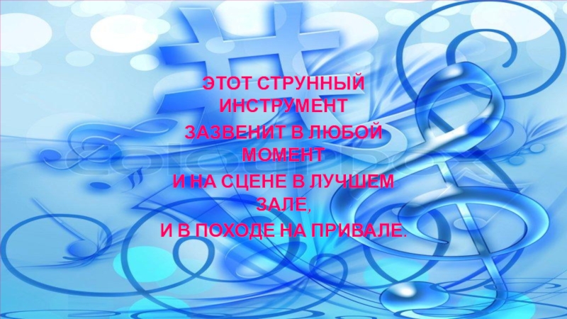 ЭТОТ СТРУННЫЙ ИНСТРУМЕНТЗАЗВЕНИТ В ЛЮБОЙ МОМЕНТ И НА СЦЕНЕ В ЛУЧШЕМ ЗАЛЕ,И В ПОХОДЕ НА ПРИВАЛЕ.