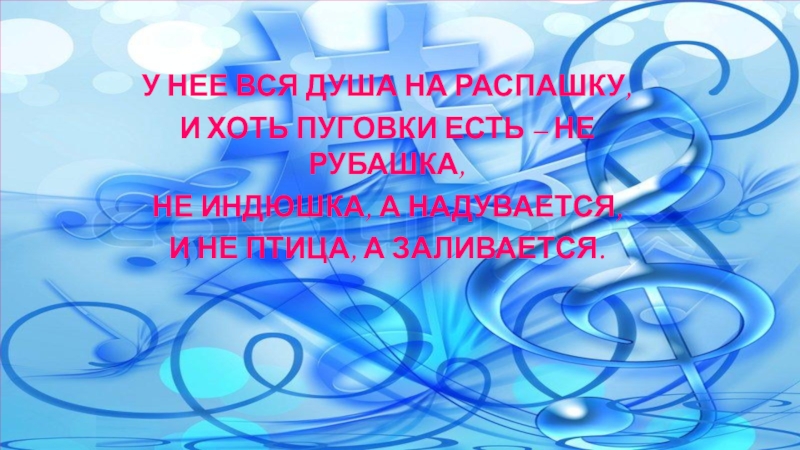 У НЕЕ ВСЯ ДУША НА РАСПАШКУ,И ХОТЬ ПУГОВКИ ЕСТЬ – НЕ РУБАШКА,НЕ ИНДЮШКА, А НАДУВАЕТСЯ,И НЕ ПТИЦА, А ЗАЛИВАЕТСЯ.