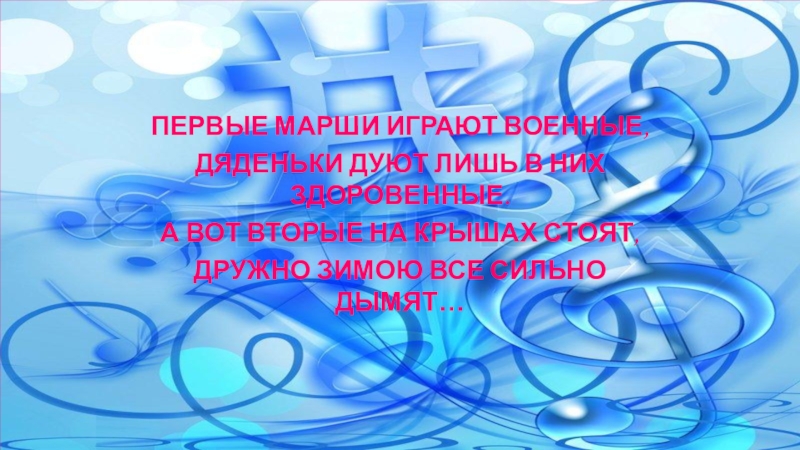 ПЕРВЫЕ МАРШИ ИГРАЮТ ВОЕННЫЕ,ДЯДЕНЬКИ ДУЮТ ЛИШЬ В НИХ ЗДОРОВЕННЫЕ.А ВОТ ВТОРЫЕ НА КРЫШАХ СТОЯТ,ДРУЖНО ЗИМОЮ ВСЕ СИЛЬНО