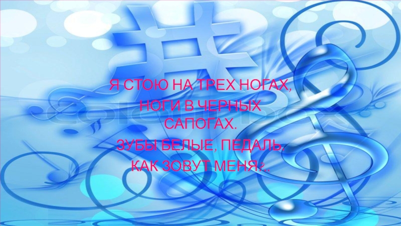 Я СТОЮ НА ТРЕХ НОГАХ,НОГИ В ЧЕРНЫХ САПОГАХ.ЗУБЫ БЕЛЫЕ, ПЕДАЛЬ.КАК ЗОВУТ МЕНЯ?..