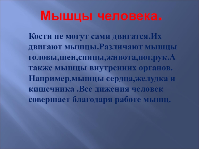 Мышцы человека.Кости не могут сами двигатся.Их двигают мышцы.Различают мышцы головы,шеи,спины,живота,ног,рук.А также мышцы внутренних органов.Например,мышцы сердца,желудка и