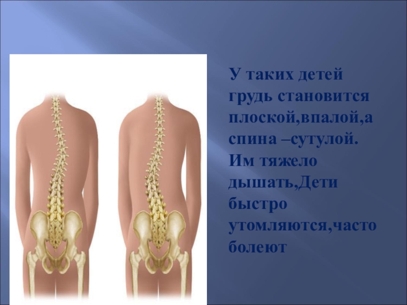 У таких детей грудь становится плоской,впалой,а спина –сутулой.Им тяжело дышать,Дети быстро утомляются,часто болеют
