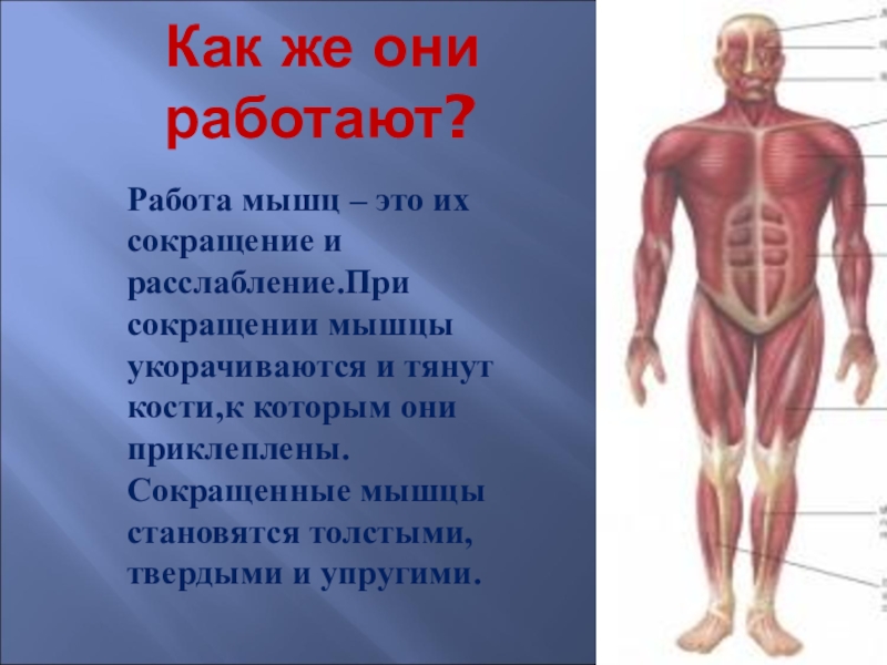 Как же они работают?Работа мышц – это их сокращение и расслабление.При сокращении мышцы укорачиваются и тянут кости,к