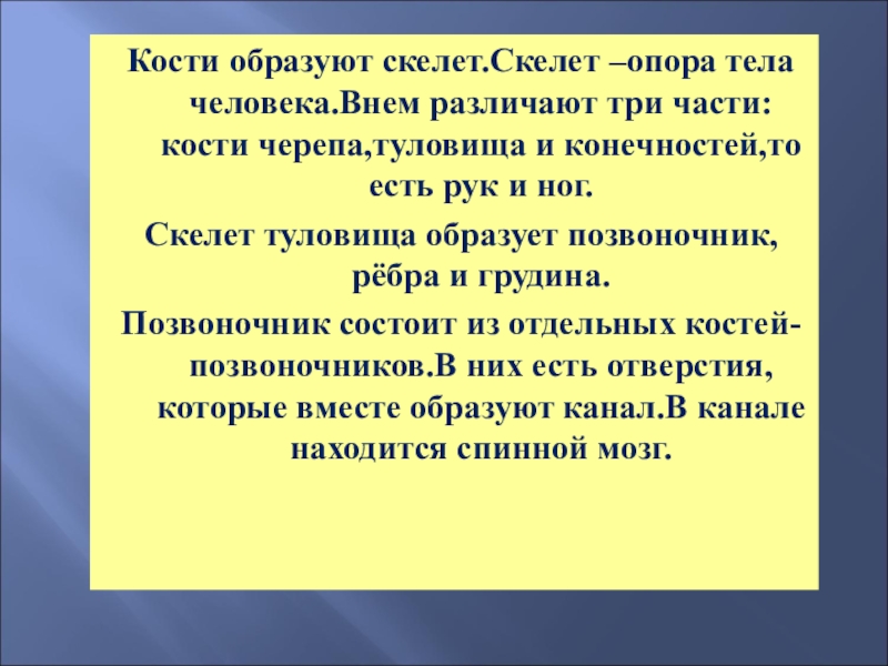 Кости образуют скелет.Скелет –опора тела человека.Внем различают три части:кости черепа,туловища и конечностей,то есть рук и ног.Скелет туловища