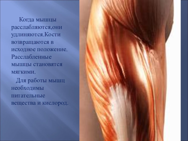 Слайд 12 Когда мышцы расслабляются,они удлиняются.Кости возвращаются в исходное положение.Расслабленные