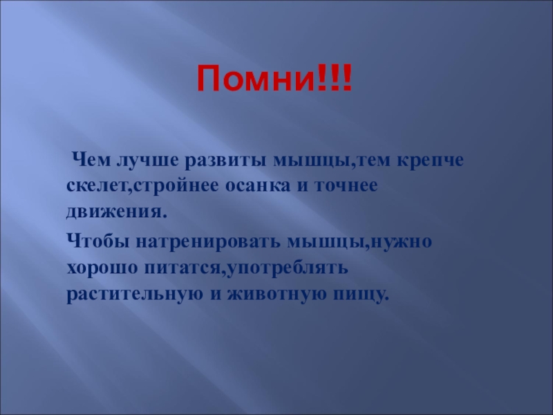 Помни!!! Чем лучше развиты мышцы,тем крепче скелет,стройнее осанка и точнее движения.Чтобы натренировать мышцы,нужно хорошо питатся,употреблять растительную и