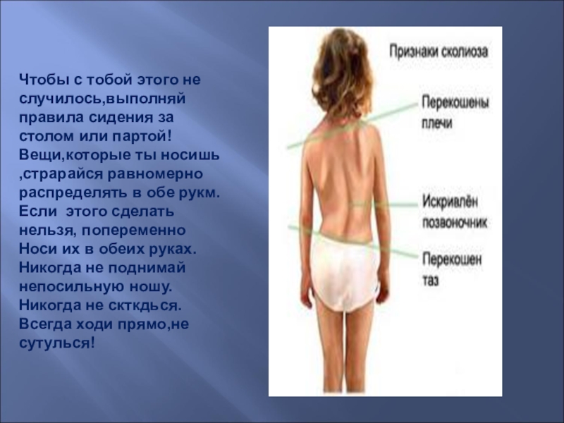 Чтобы с тобой этого не случилось,выполняй правила сидения за столом или партой!Вещи,которые ты носишь ,страрайся равномерно распределять