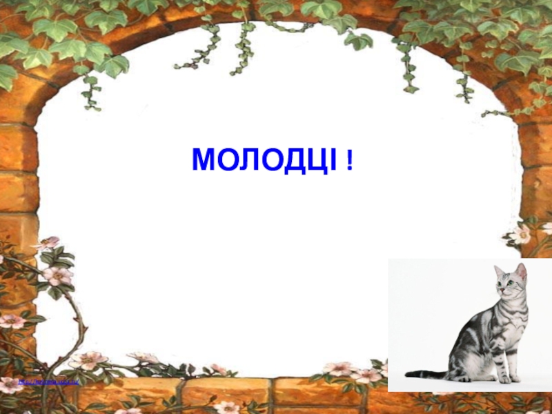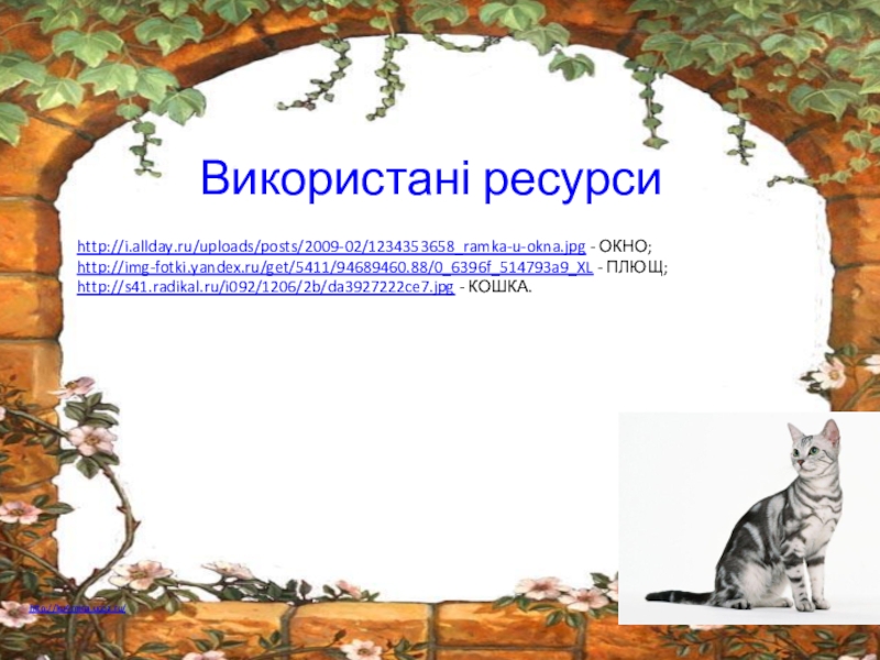 Використані ресурсиhttp://i.allday.ru/uploads/posts/2009-02/1234353658_ramka-u-okna.jpg - ОКНО;http://img-fotki.yandex.ru/get/5411/94689460.88/0_6396f_514793a9_XL - ПЛЮЩ;http://s41.radikal.ru/i092/1206/2b/da3927222ce7.jpg - КОШКА.
