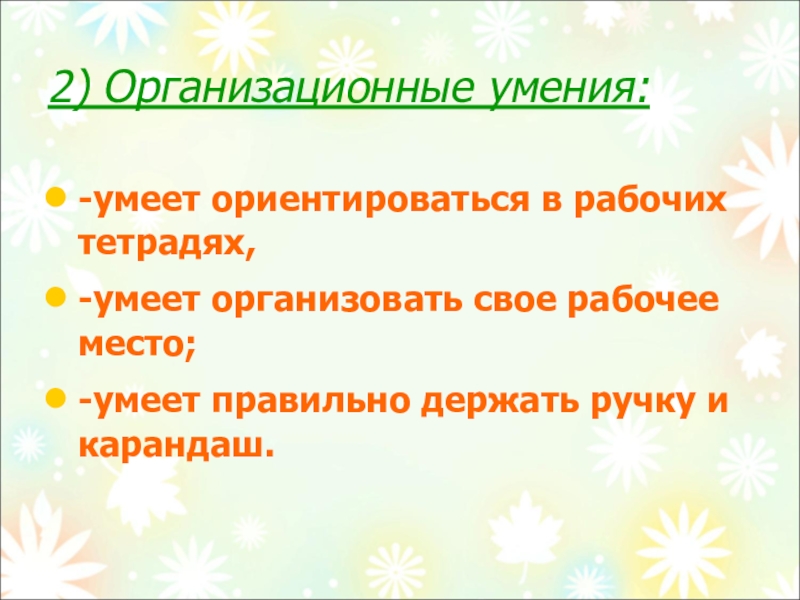 2) Организационные умения:-умеет ориентироваться в рабочих тетрадях, -умеет организовать свое рабочее место;-умеет правильно держать ручку и карандаш.