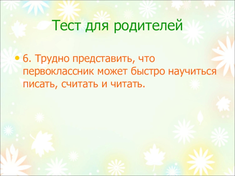 Презентация, доклад на тему Скоро в школу тест для родителей будущих первоклассников