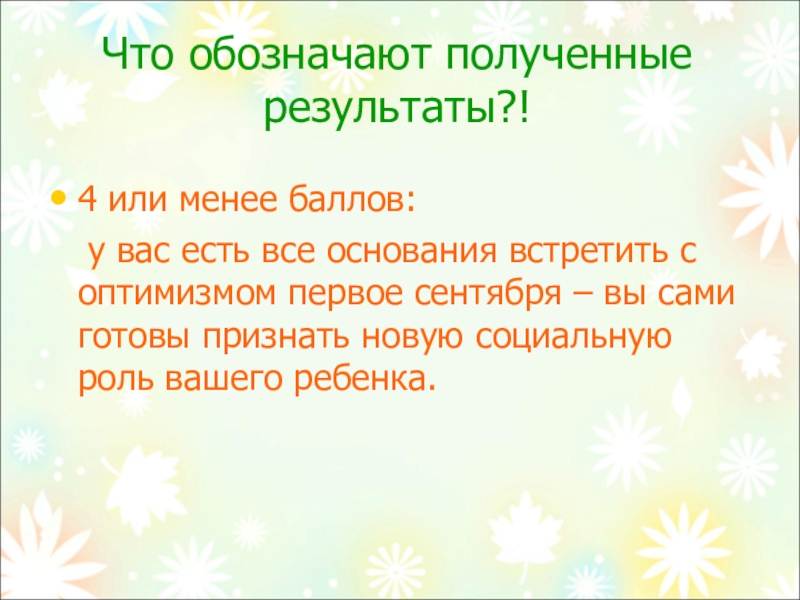Что обозначают полученные результаты?!4 или менее баллов: 	у вас есть все основания встретить с оптимизмом первое сентября