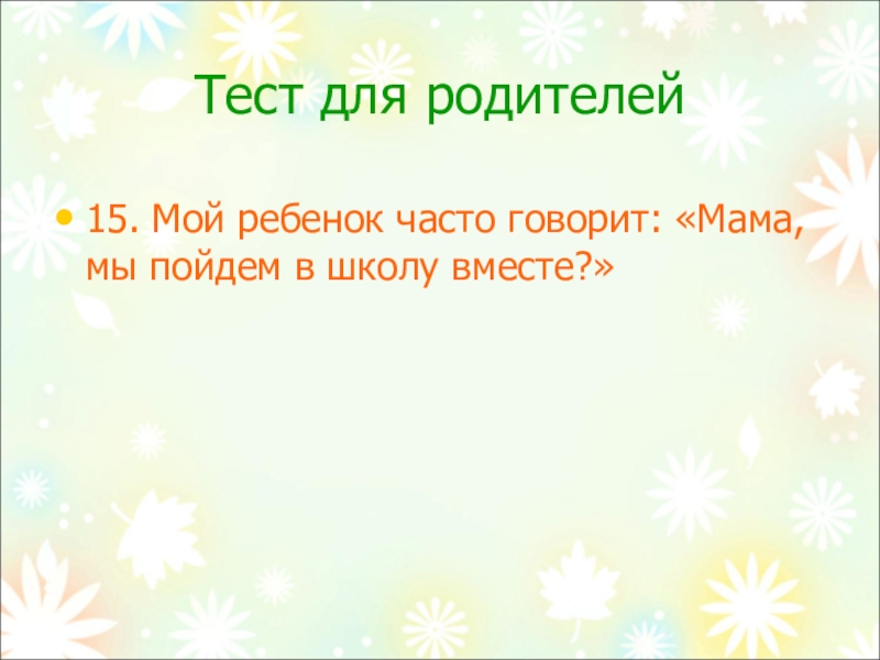 Тест для родителей15. Мой ребенок часто говорит: «Мама, мы пойдем в школу вместе?»
