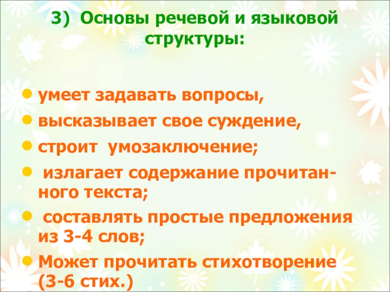 3) Основы речевой и языковой структуры: умеет задавать вопросы,высказывает свое суждение,строит умозаключение; излагает содержание прочитан-ного текста; составлять