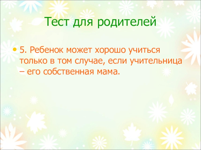 Тест для родителей5. Ребенок может хорошо учиться только в том случае, если учительница – его собственная мама.