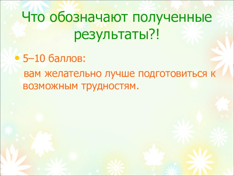 Что обозначают полученные результаты?!5–10 баллов:  вам желательно лучше подготовиться к возможным трудностям.