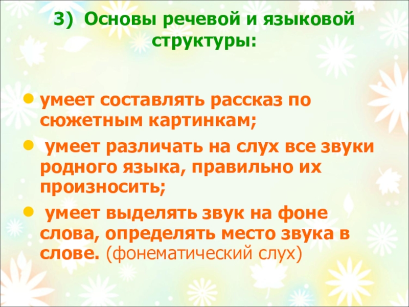 3) Основы речевой и языковой структуры: умеет составлять рассказ по сюжетным картинкам; умеет различать на слух все