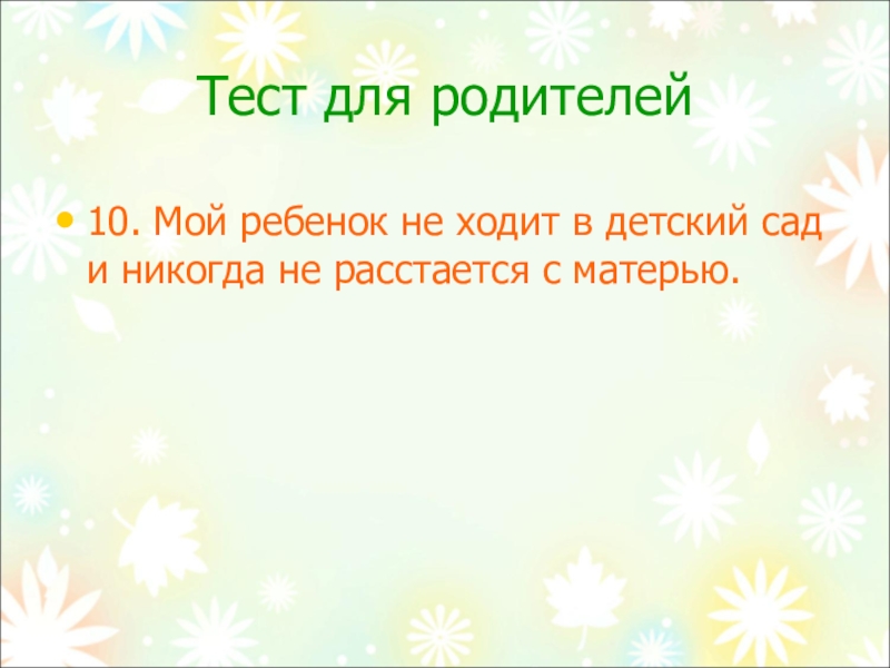 Тест для родителей10. Мой ребенок не ходит в детский сад и никогда не расстается с матерью.