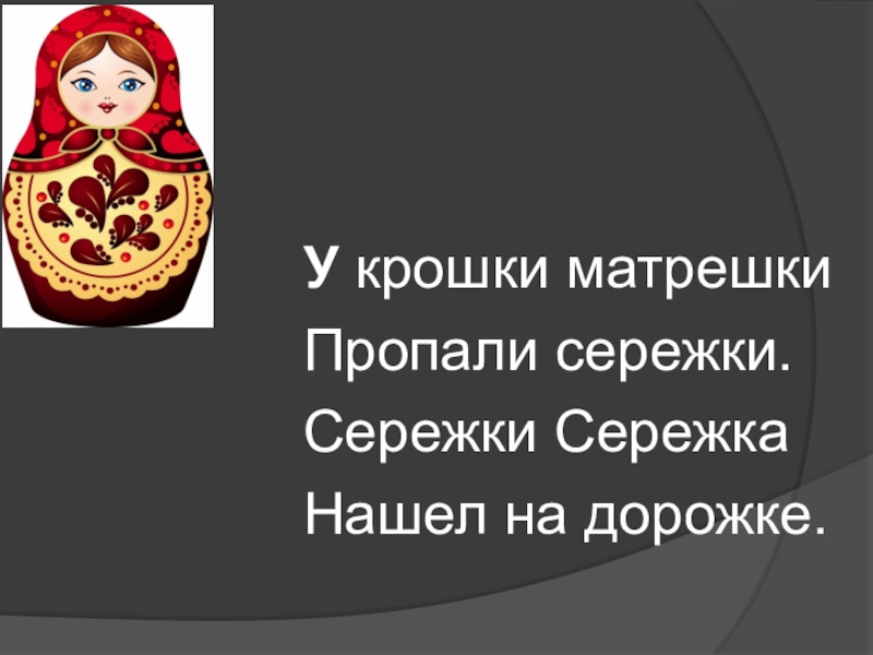 У крошки матрешкиПропали сережки.Сережки СережкаНашел на дорожке.