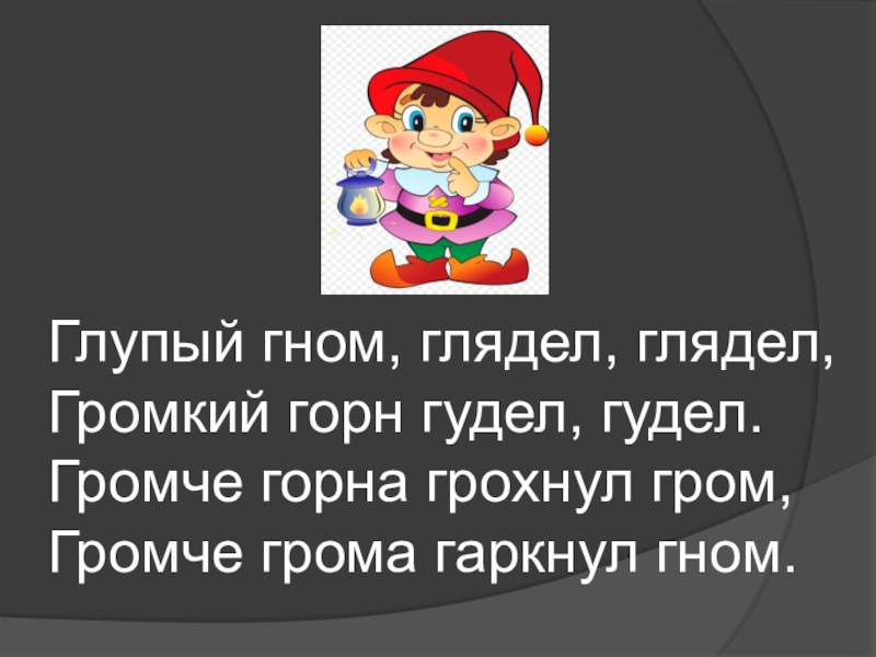 Глупый гном, глядел, глядел, Громкий горн гудел, гудел. Громче горна грохнул гром, Громче грома гаркнул гном.