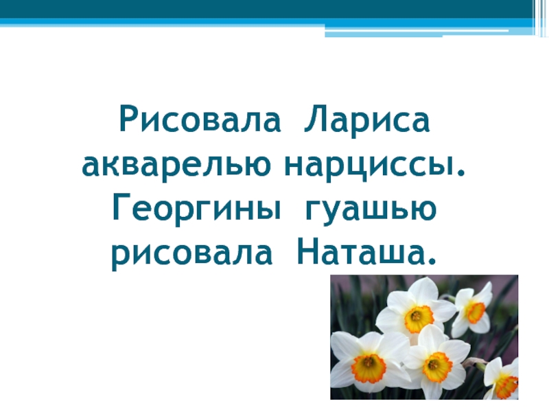 Слайд 16Рисовала Лариса акварелью нарциссы. Георгины гуашью рисовала Наташа.