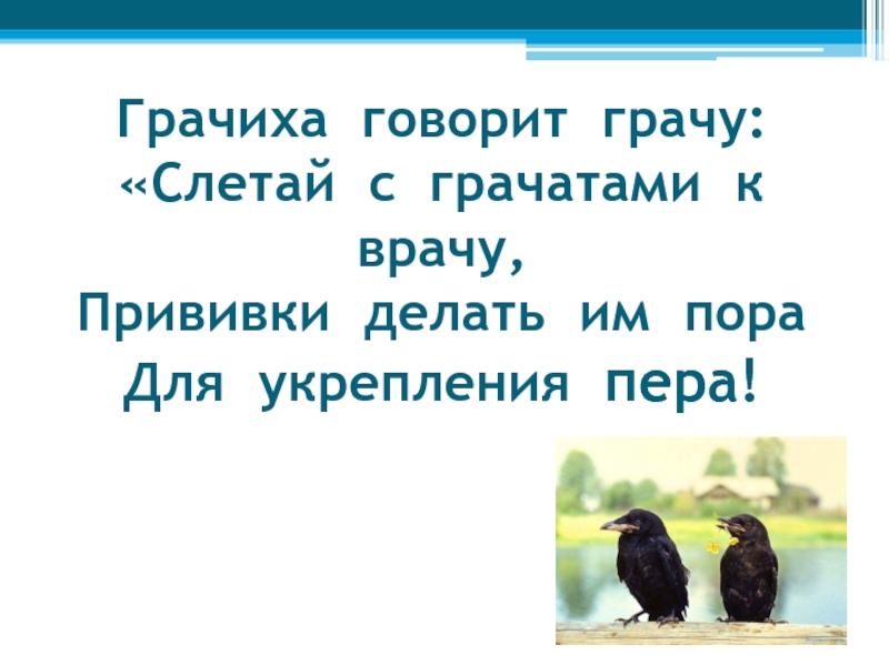 Слайд 7Грачиха говорит грачу: «Слетай с грачатами к врачу, Прививки делать им пора Для укрепления