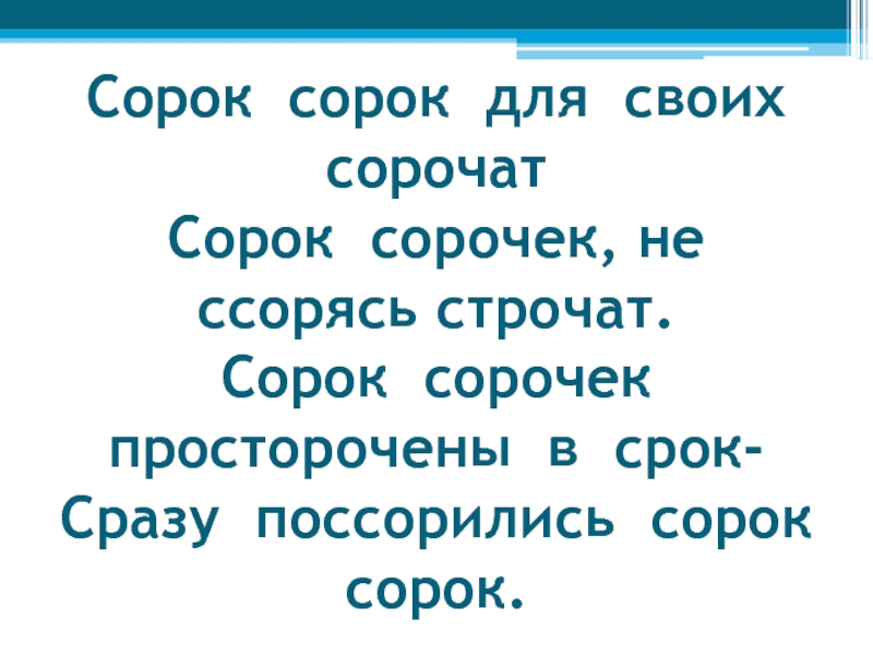 Сорок сорок для своих сорочат Сорок сорочек, не ссорясь строчат. Сорок сорочек просторочены в срок- Сразу поссорились