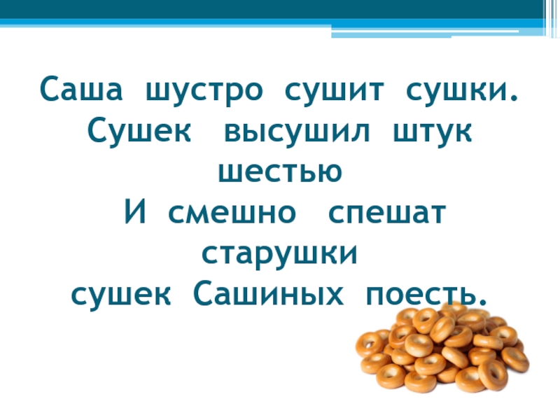 Слайд 32Саша шустро сушит сушки. Сушек высушил штук шестью И смешно