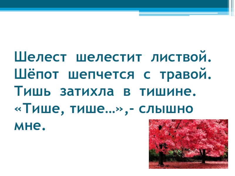 Слайд 31Шелест шелестит листвой. Шёпот шепчется с травой. Тишь затихла в тишине. «Тише, тише…»,- слышно