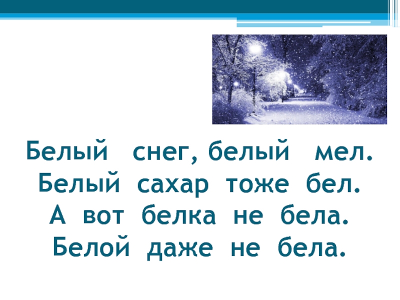 Слайд 26Белый снег, белый мел. Белый сахар тоже бел. А вот белка