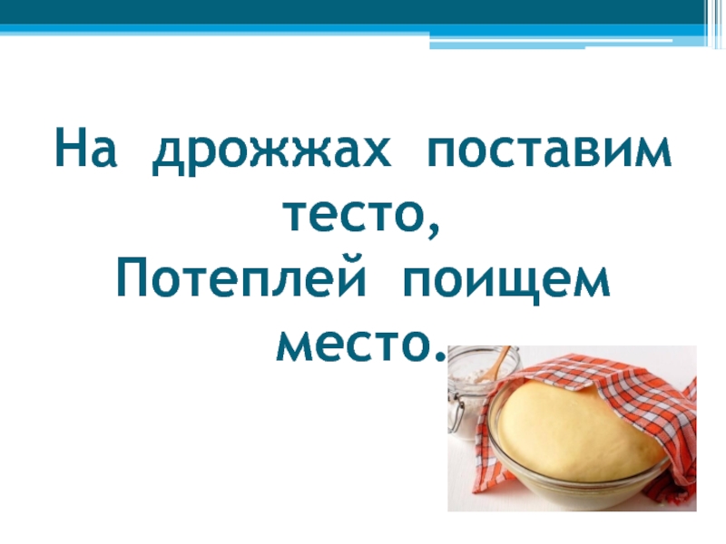 Слайд 21На дрожжах поставим тесто, Потеплей поищем место.