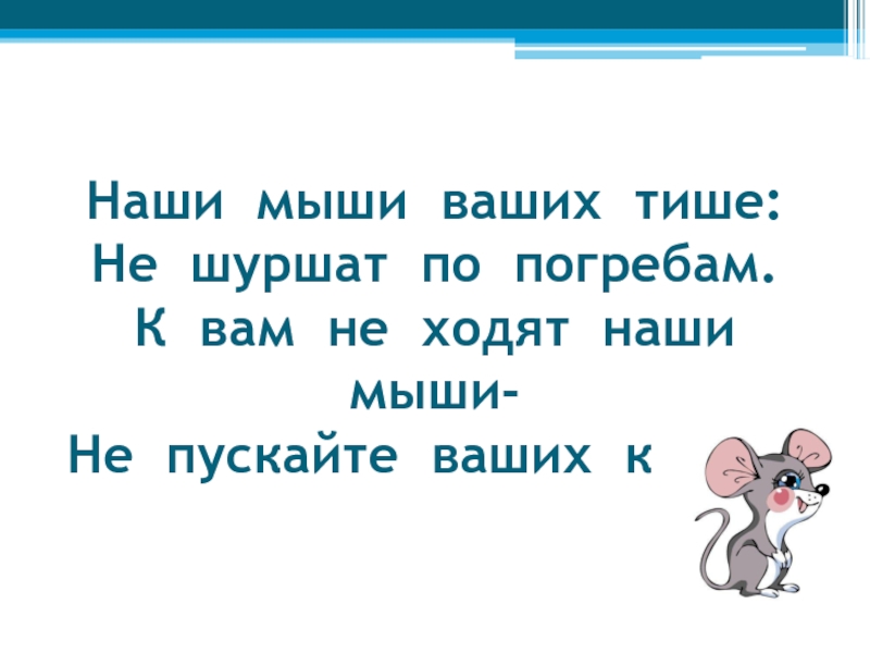 Слайд 33Наши мыши ваших тише: Не шуршат по погребам. К вам не ходят наши