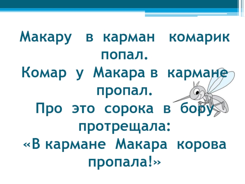 Макару  в карман  комарик попал. Комар у Макара в кармане пропал. Про это сорока в