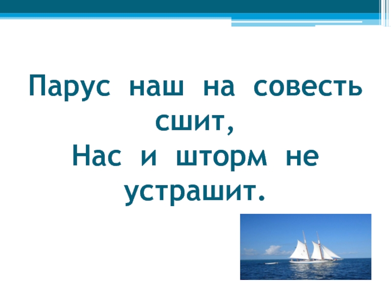 Слайд 28Парус наш на совесть сшит, Нас и шторм не устрашит.