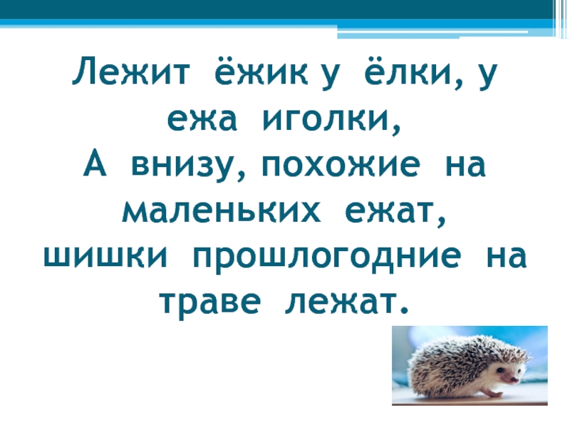 Слайд 18Лежит ёжик у ёлки, у ежа иголки, А внизу, похожие на маленьких