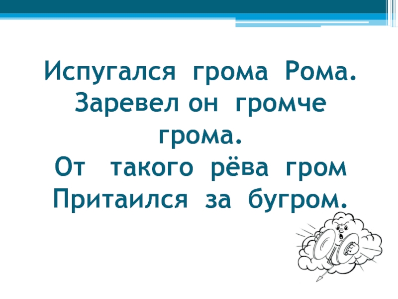 Слайд 9Испугался грома Рома. Заревел он громче грома. От такого рёва гром Притаился