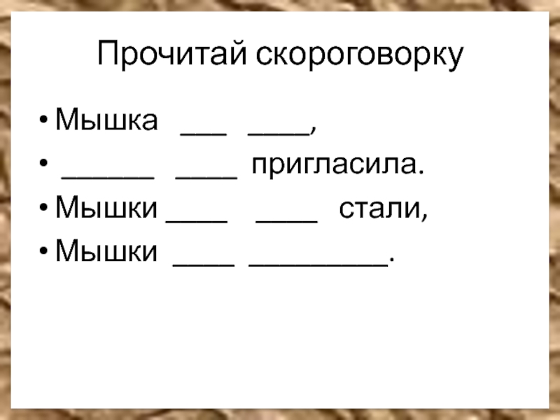 Прочитай скороговоркуМышка  ___  ____, ______  ____ пригласила.Мышки ____  ____  стали,Мышки ____ _________.