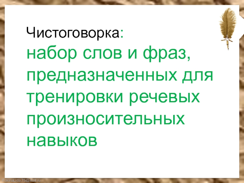 Чистоговорка:набор слов и фраз, предназначенных для тренировки речевых произносительных навыков