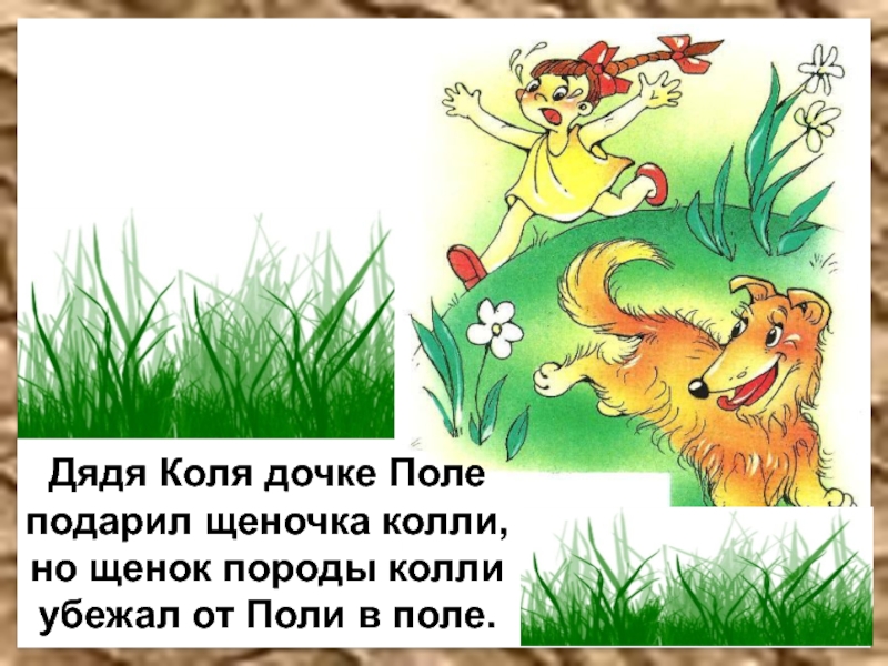 Дядя Коля дочке Полеподарил щеночка колли,но щенок породы коллиубежал от Поли в поле.