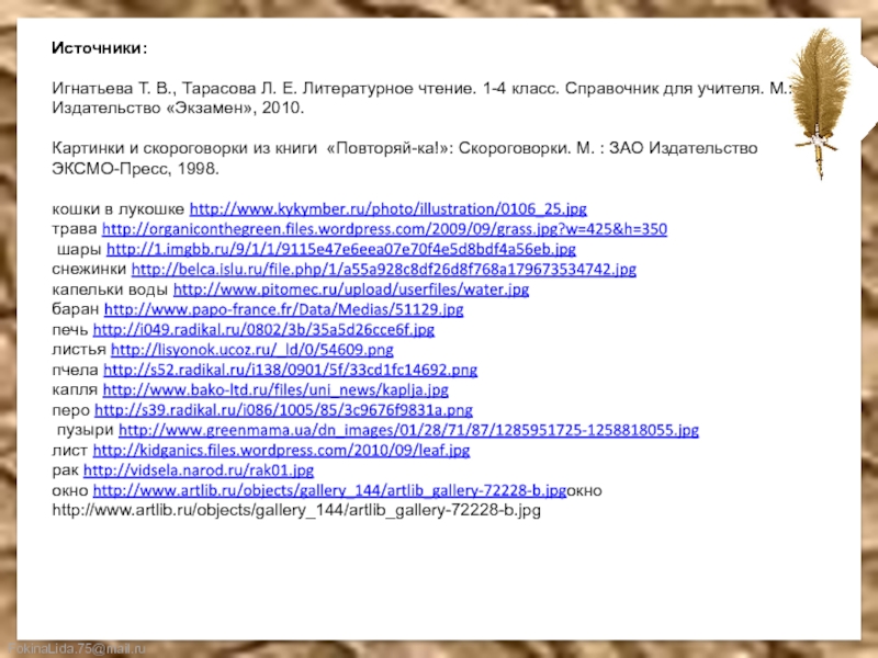 для учителя. М.: Издательство «Экзамен», 2010. Картинки и скороговорки из книги «Повторяй-ка!»: Скороговорки. М. : ЗАО Издательство ЭКСМО-Пресс, 1998. кошки в лукошке http://www.kykymber.ru/photo/illustration/0106_25.jpg трава http://organiconthegreen.files.wordpress.com/2009/09/grass.jpg?w=425&h=350 шары http://1.imgbb.ru/9/1/1/9115e47e6eea07e70f4e5d8bdf4a56eb.jpg снежинки http://belca.islu.ru/file.php/1/a55a928c8df26d8f768a179673534742.jpg капельки воды http://www.pitomec.ru/upload/userfiles/water.jpg баран http://www.papo-france.fr/Data/Medias/51129.jpg печь http://i049.radikal.ru/0802/3b/35a5d26cce6f.jpg листья http://lisyonok.ucoz.ru/_ld/0/54609.png пчела http://s52.radikal.ru/i138/0901/5f/33cd1fc14692.png капля http://www.bako-ltd.ru/files/uni_news/kaplja.jpg перо http://s39.radikal.ru/i086/1005/85/3c9676f9831a.png пузыри http://www.greenmama.ua/dn_images/01/28/71/87/1285951725-1258818055.jpg лист http://kidganics.files.wordpress.com/2010/09/leaf.jpg рак http://vidsela.narod.ru/rak01.jpg окно http://www.artlib.ru/objects/gallery_144/artlib_gallery-72228-b.jpgокно http://www.artlib.ru/objects/gallery_144/artlib_gallery-72228-b.jpg
