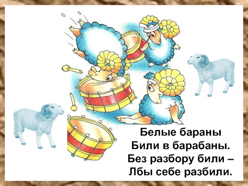Белые бараныБили в барабаны.Без разбору били –Лбы себе разбили.