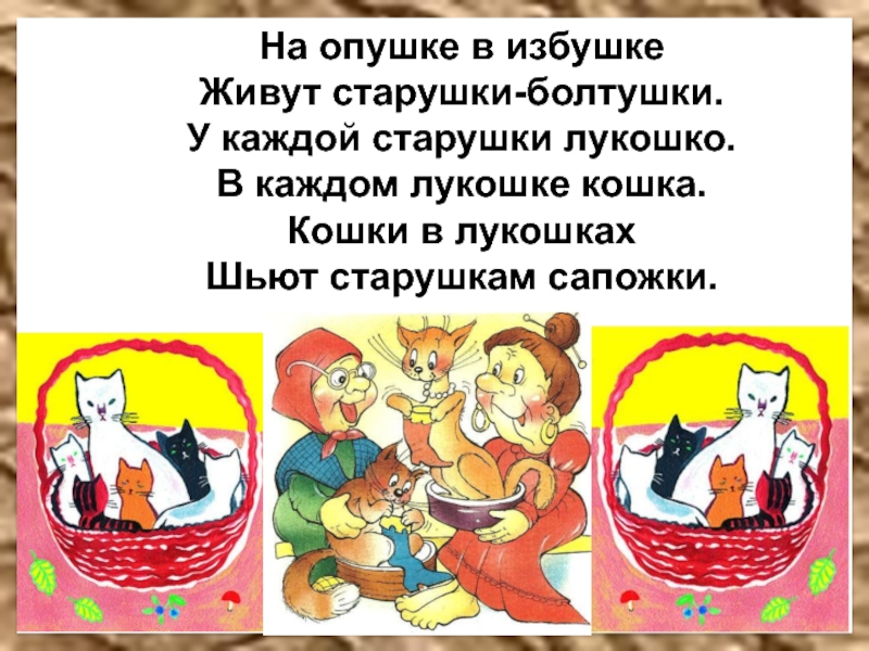 На опушке в избушкеЖивут старушки-болтушки.У каждой старушки лукошко.В каждом лукошке кошка.Кошки в лукошкахШьют старушкам сапожки.