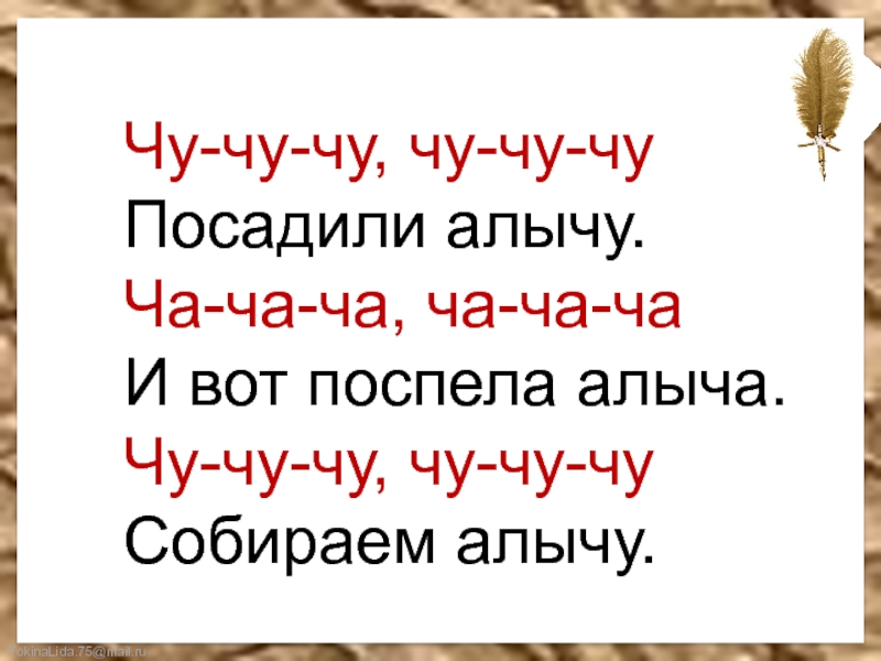 Слайд 7Чу-чу-чу, чу-чу-чу Посадили алычу. Ча-ча-ча, ча-ча-ча И вот поспела алыча. Чу-чу-чу, чу-чу-чу Собираем алычу.